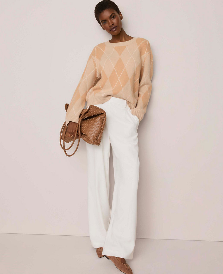 Timeless and sophisticated, this argyle sweater can be worn on its own or styled over a classic collared shirt. Ribbed crew neck, cuffs, and hem. Long sleeves. Dropped shoulders.