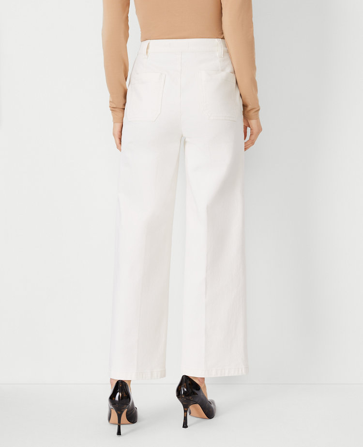 Topped with button front plackets for a nautical nod, these wide leg crop jeans feature a flattering high waist. Front zip with hook-and-bar closure. Button front plackets. Back belt loops. Back patch pockets.
