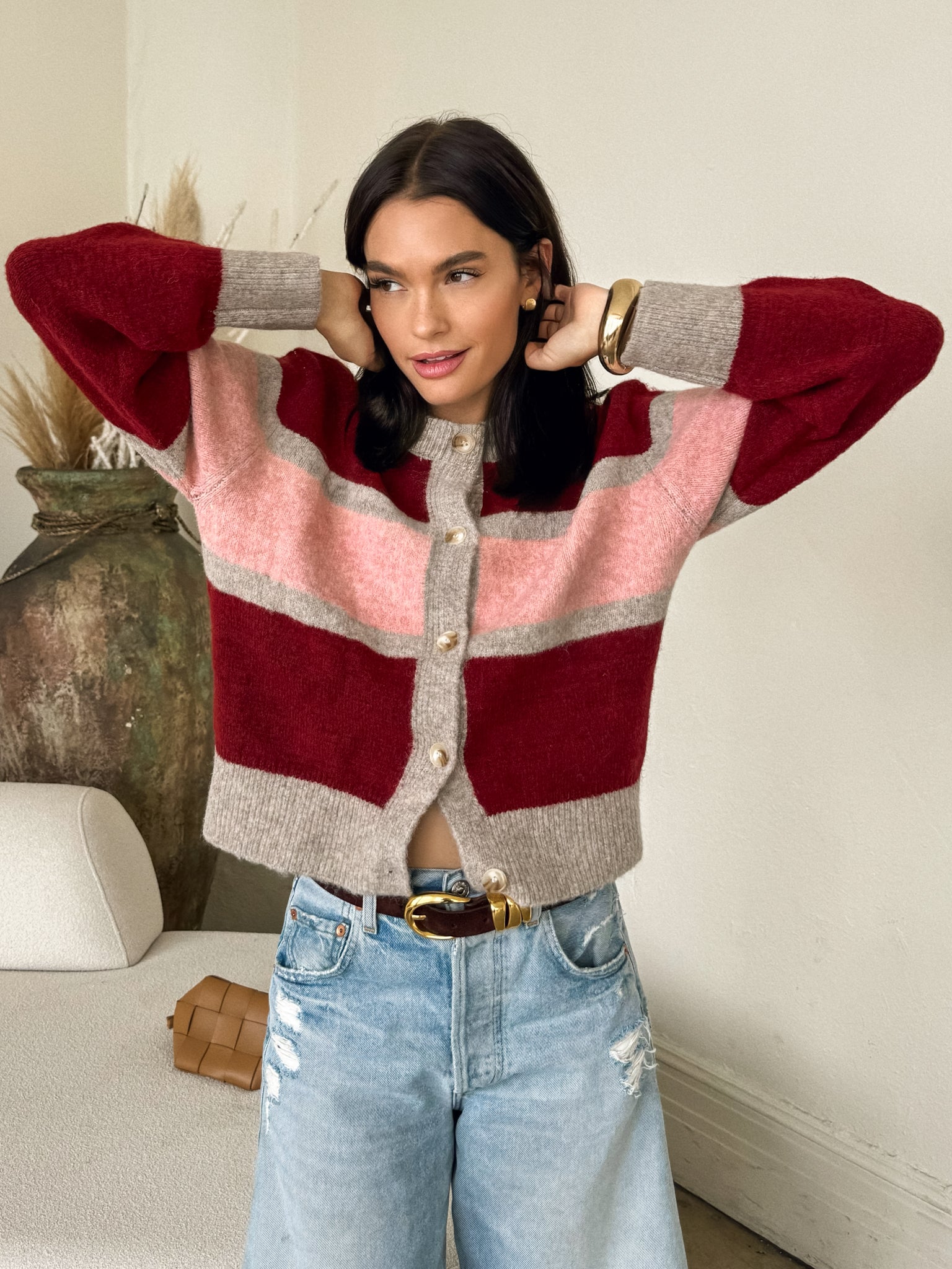 Meet our new go-to sweater this winter season! Our Octavia Button Down Sweater features a color block pattern and cozy knit material. Style this sweater with your favorite pair of relaxed denim. birks. and crochet mini bag for an effortless winter look! Accessorize with a belt and gold jewelry.