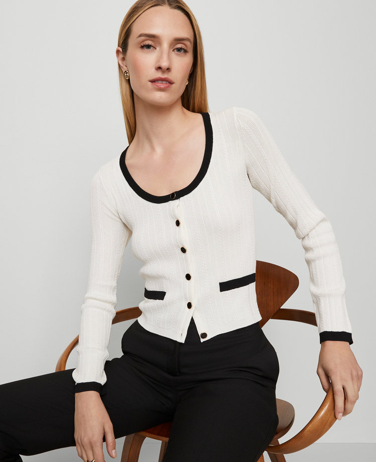 A contrast trim frames this must-have cardigan for a polished and chic appeal. Scoop neck. Front-button closures. Long sleeves. Ribbed cuffs and hem. Welt pockets.