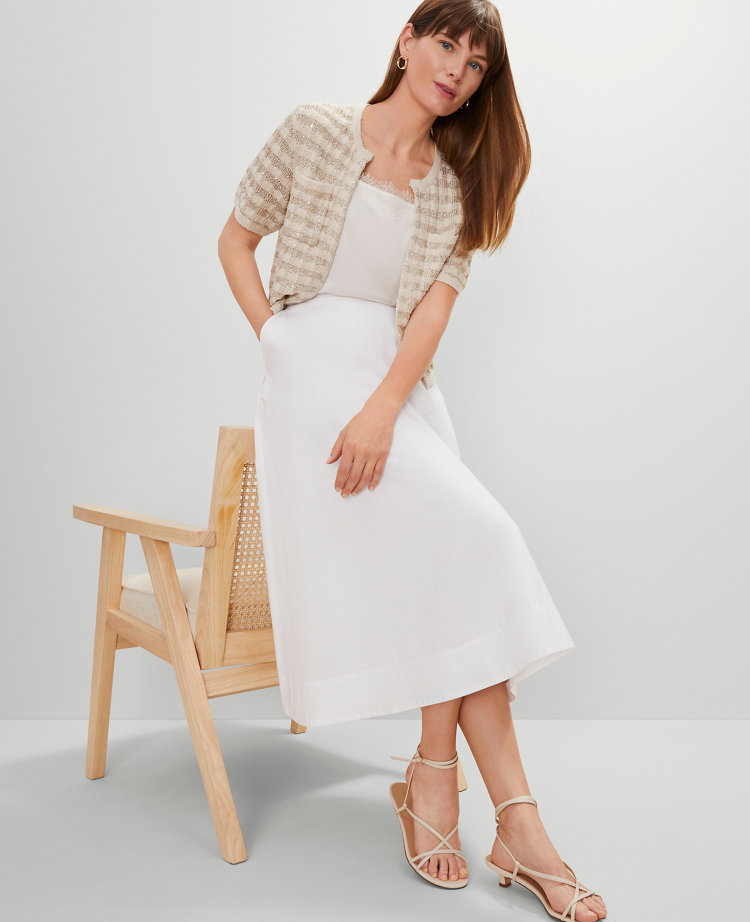 Elevate your wardrobe with this luxe tweed sweater jacket, punctuated with a pretty metallic finish. Crew neck. Short sleeves. Chest patch pockets.