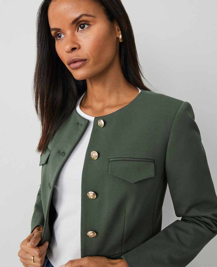 In a smooth ponte knit, our crew neck jacket features clean lines and polished button details. Round neck. Button front. Long sleeves with button cuffs. Four front flap pockets. Lined.