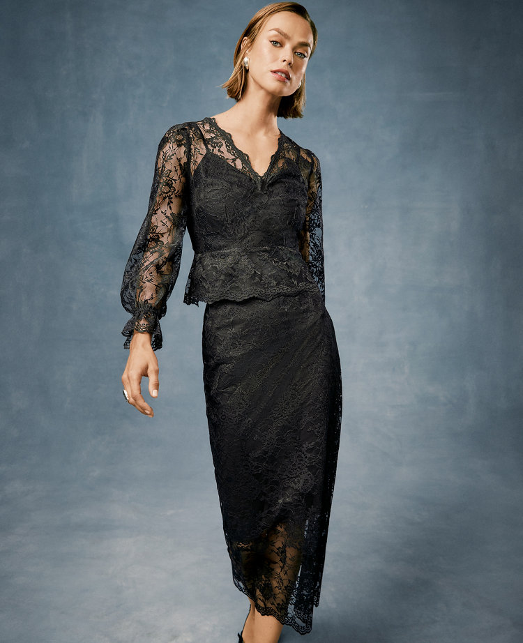 Feminine and refined, this lace blouse is designed with pretty scalloped detailing that lends the perfect touch of romance to any outfit. V-neck. Long sleeves with elasticized cuffs. Hidden side zip closure. Detachable cami lining with adjustable spaghetti straps.