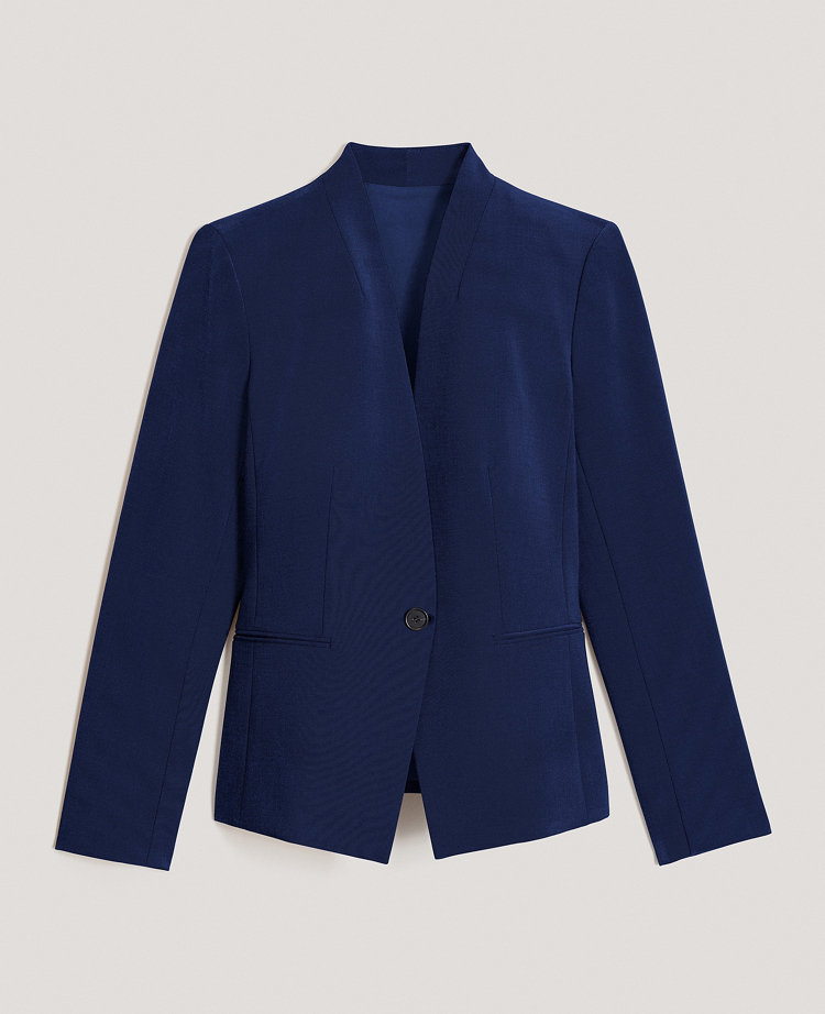 Refined four-way stretch holds its shape while flattering yours – so you stay polished and comfortable from A.M. to P.M. Long button-open sleeves allow for versatility in styling. One button front. Front besom pockets. Back vent.