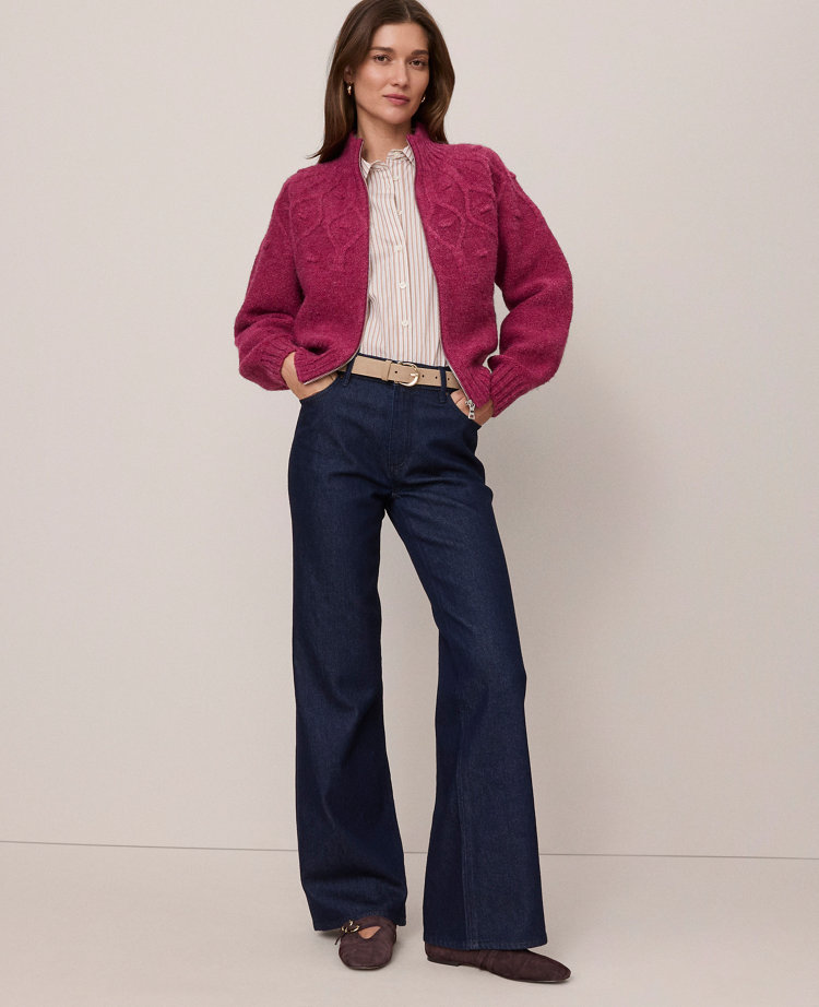 Discover Ann Taylor Weekend. Effortlessly polished, lived-in looks for wherever your plans take you. Punctuated by crocheted bubble detailing, this cable knit bomber jacket has sporty yet feminine appeal. Ribbed stand collar, cuffs and hem. Front-zip closure. Long raglan sleeves.