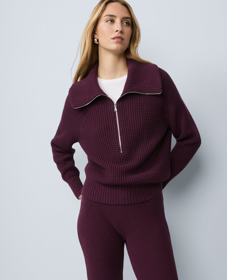 Discover Ann Taylor Weekend. Effortlessly polished pieces for wherever your plans take you. A half-zip closure gives this waffle-textured sweater an elevated feel. Ribbed V-neck, cuffs and hem. Half-zip closure. Long raglan sleeves.