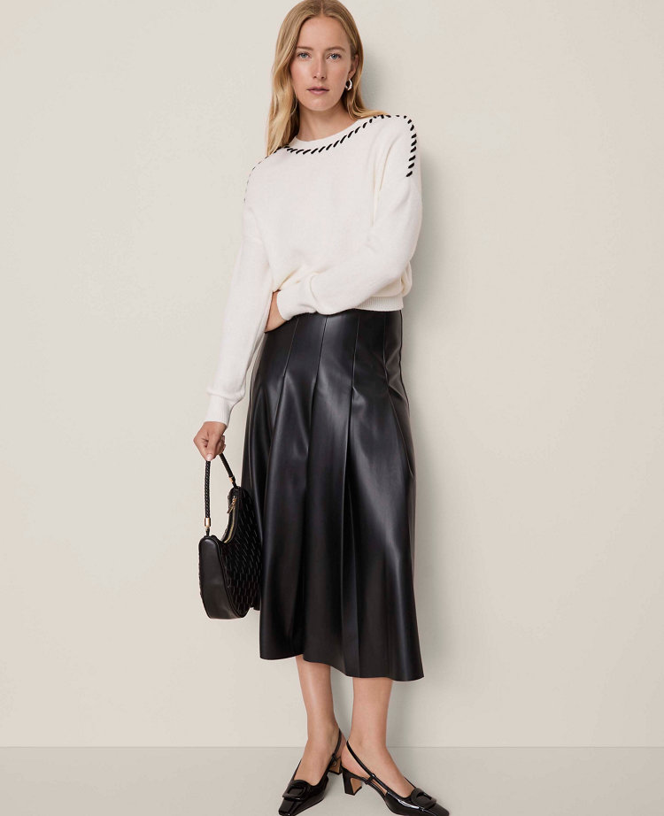 Intricate whipstitch detailing adds an artisanal feel to this chic and versatile sweater. Crew neck. Ribbed long sleeves, cuffs, and hem. Dropped shoulders.